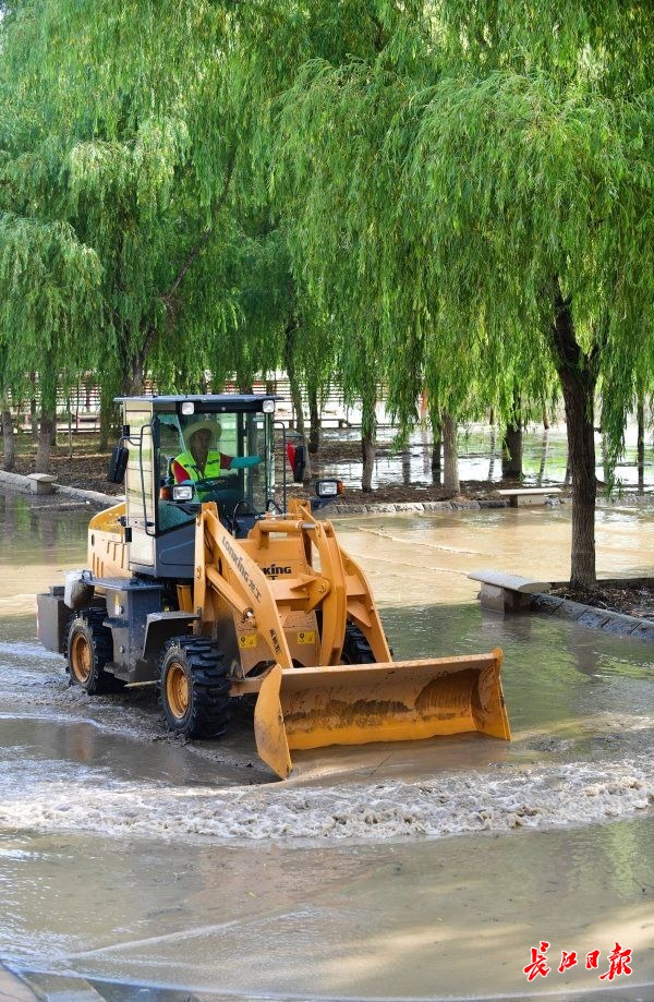 长江日报-长江网9月4日讯 9月4日,汉口江滩渡江博物馆下游方向的二级亲水平台上,一辆铲车和十多名工人配合,铲除、冲洗江水退去后留下的淤泥。干净的石材铺装地面随之显露出来。 工作人员还解除了部分一级平台观江步道路灯杆上的警戒绳。 (记者李永刚 摄影报道)