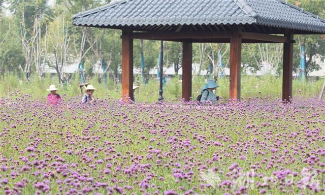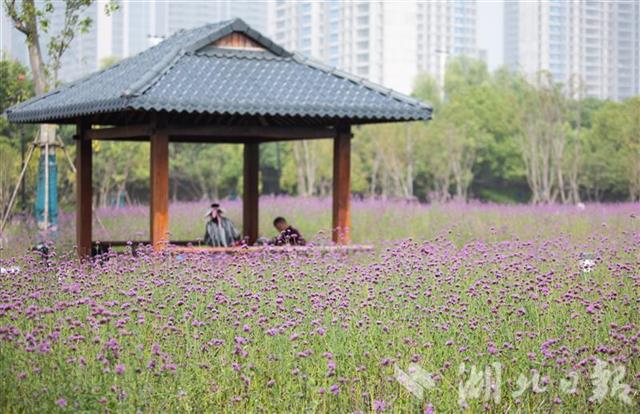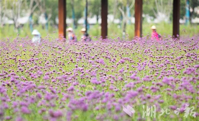 9月24日,武汉汉口江滩近9000平方米的柳叶马鞭草盛放,让人仿佛置身在紫色的海洋中,成为市民国庆、中秋假期游玩的好去处。(湖北日报全媒记者 薛婷 摄)