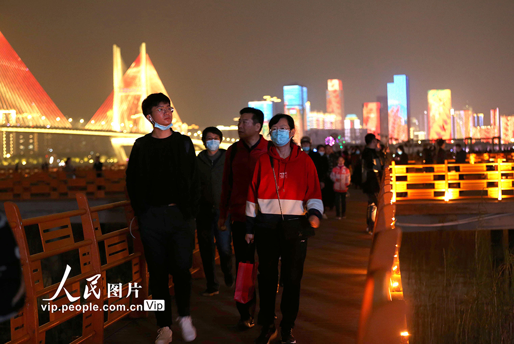 2020年10月7日,国庆长假第7天,武汉多日的雨天结束。不少游客和武汉市民,来到汉口江滩欣赏美丽夜景。