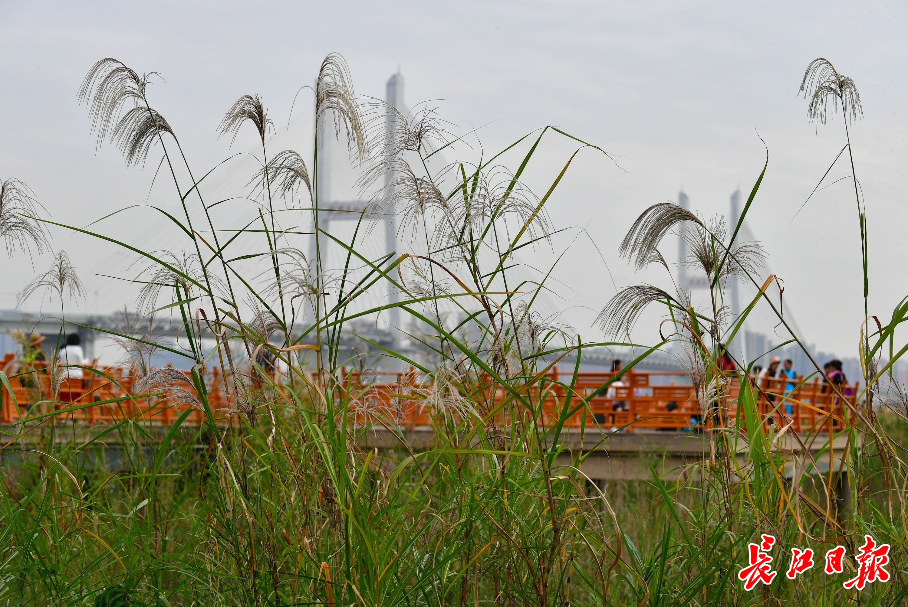 汉口江滩观芦栈道旁,荻花在空中摇曳。