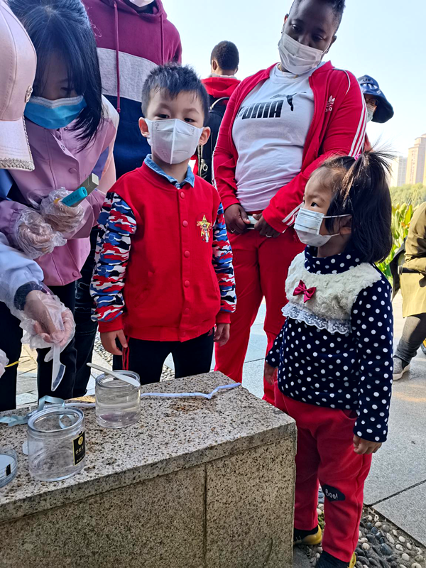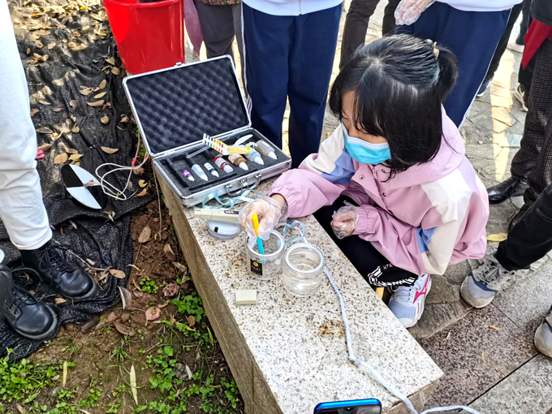 晴川初级中学的学生选取了一处合适场地,为大家演示他们带来的仪器,对墨水湖进行简单的水质检测,成功吸引了公园游客的注意力,特别是两名可爱的小朋友。