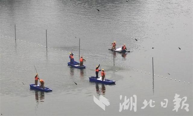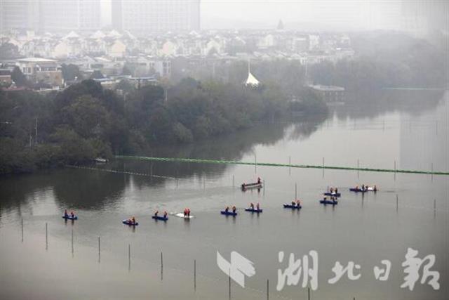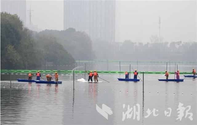 2020年12月8日,在武汉市临空港经济开发区金银湖环湖东路附近的湖面上,工作人员正在湖中作业。据了解,近期金银湖启动水体提质工程,围绕水质提升目标,改善湖泊水生态环境,打造良好居住环境,让市民享受到更大的水环境提升成果。(湖北日报全媒记者 倪娜 摄)