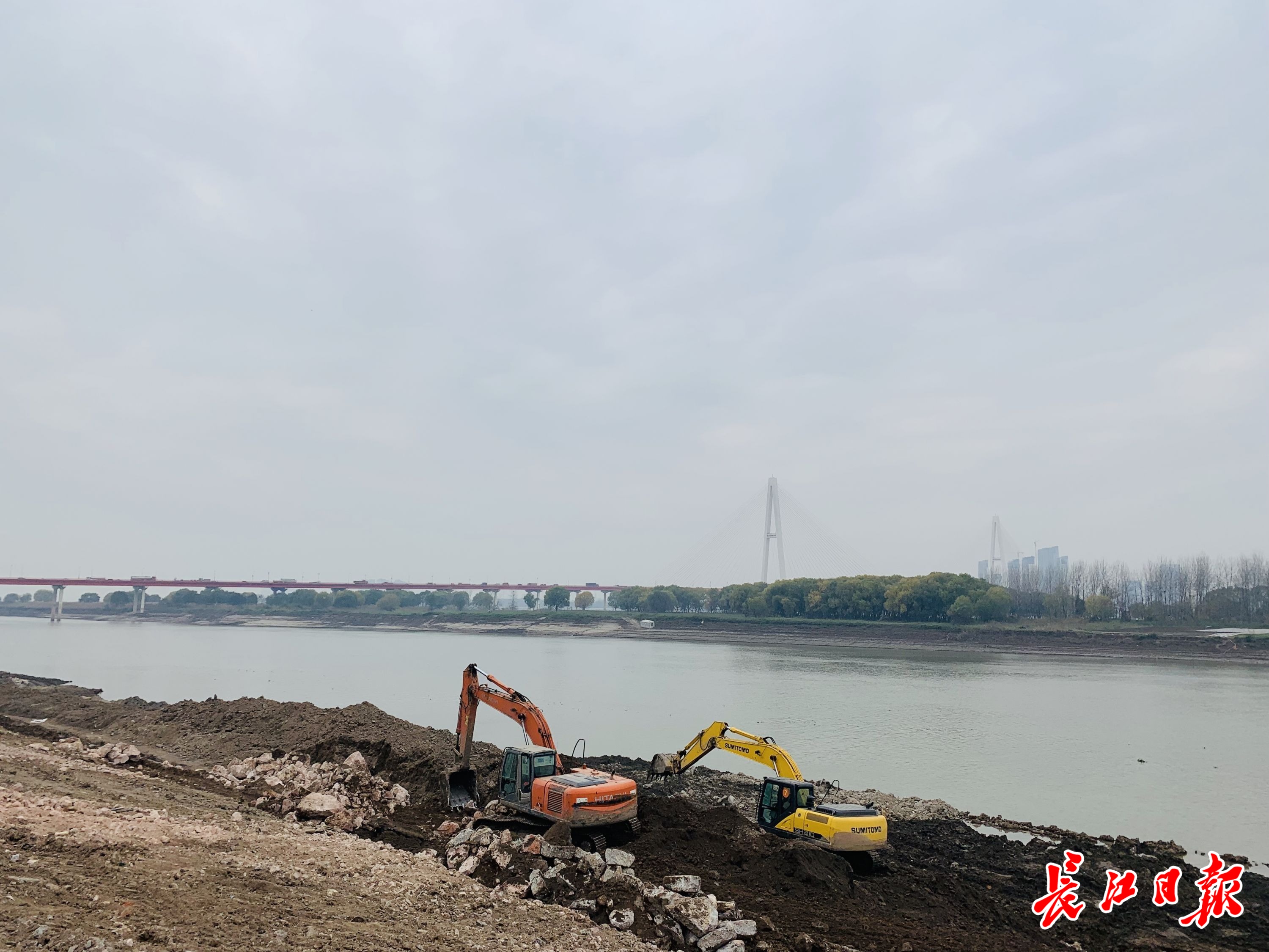 记者随姚京从白沙洲长江大桥往杨泗港长江大桥方向步行2公里,只见沿长江岸线,建设者们正在抓紧时间施工,挖掘机、运输车辆来往不断,现场一派热火朝天景象。