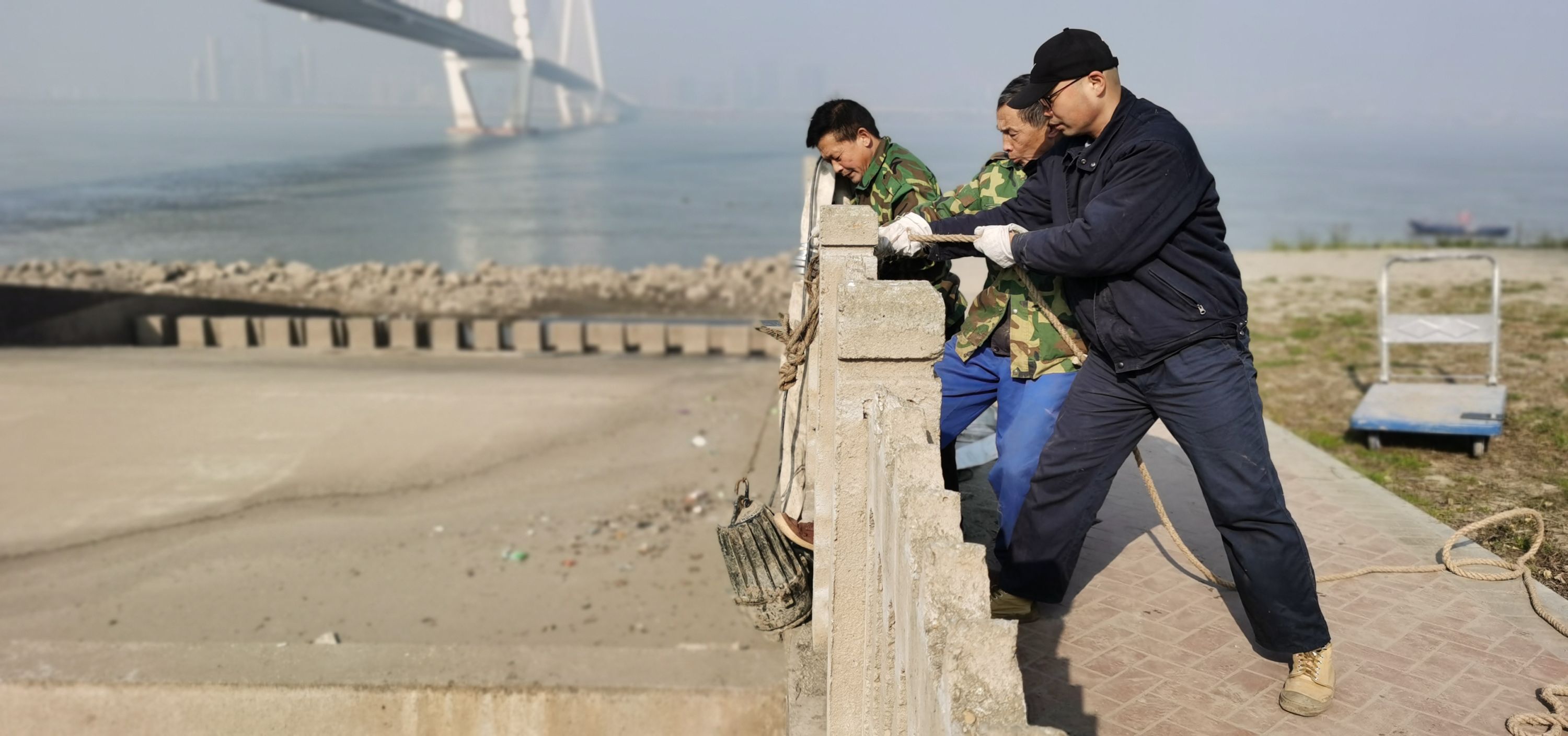 二话不说,他抄起3米长的捞草耙从边上开始捞草。杂草又细又长,伸下去的捞草耙总是使不上劲。不一会周波身上已经是雨汗交加。直到早上6点管理所疏捞队赶到,他和同事们才放下手上工具休息。超过三个半小时的机械作业,周波腰酸背痛。