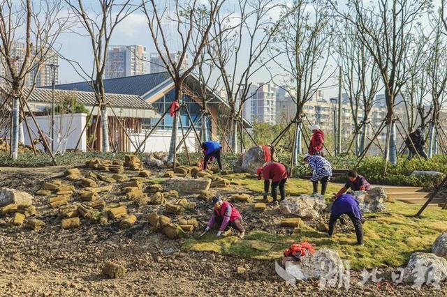 1月17日,园林工人正在巡司河活水公园内铺设草皮。