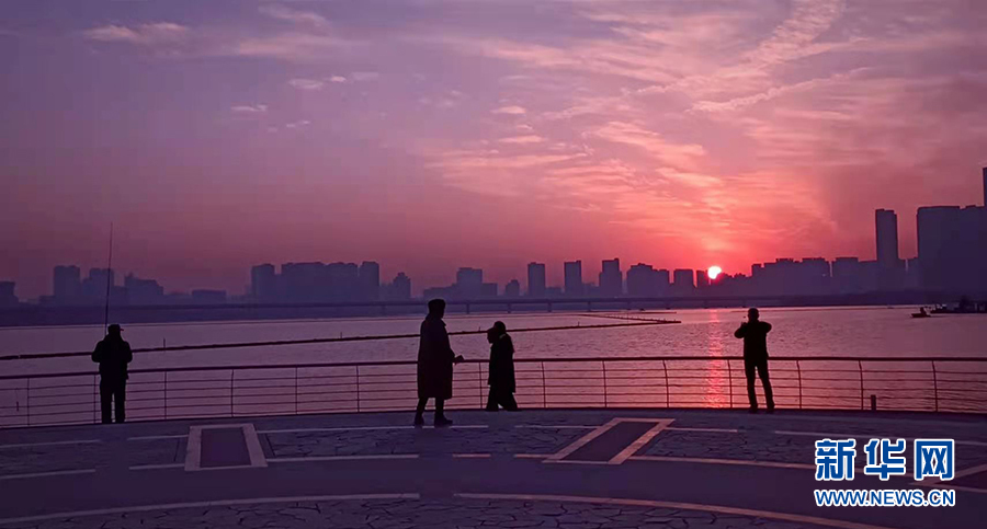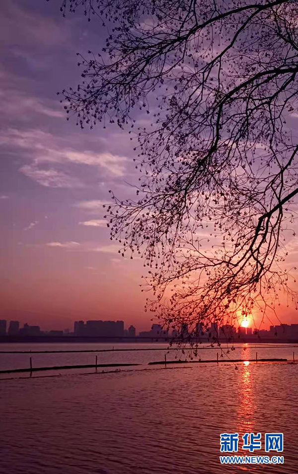 沙湖位于武汉市武昌区,是武汉市面积位居前列的“城中湖”。近年来经过治理,沙湖水质日益好转,环境逐步改善,成为市民休闲娱乐好去处。近日,武汉市天气晴好,夕阳之下,落霞满天,与湖水相互辉映,吸引市民纷纷拍照。新华网发 李海贵摄