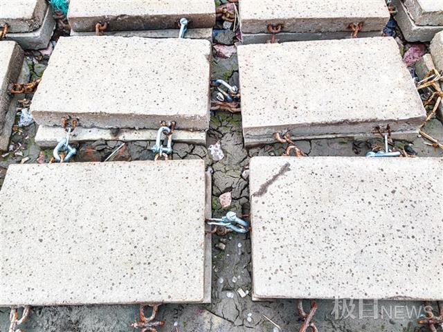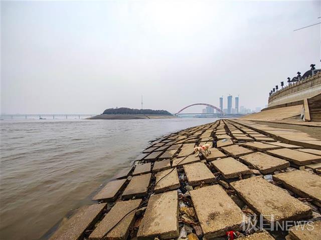 22日,从晴川桥上俯瞰,因水位下降,汉江集家嘴段露出大面积滩涂,右岸的南岸嘴洲尾也露出百余米长的沙滩。记者来到长江龙王庙江段,此处岸边露出大面积护岸石,这些一米见方的护岸石由锁链连接在一起。