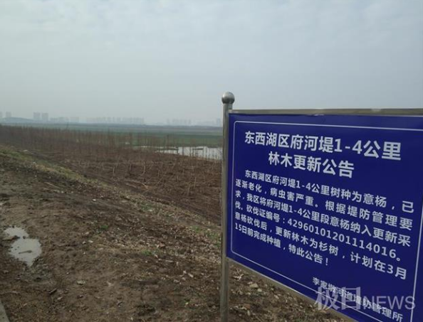 在大堤上有多块公告牌,公告显示:东西湖区府河堤1—4公里树种为意杨,已逐渐老化,病虫害严重。根据堤防管理要求,我区将府河堤1—4公里段意杨脑乳更新采伐。公告牌还标注了砍伐证编号,并表示更新林木为杉树,计划在3月15日前完成种植。