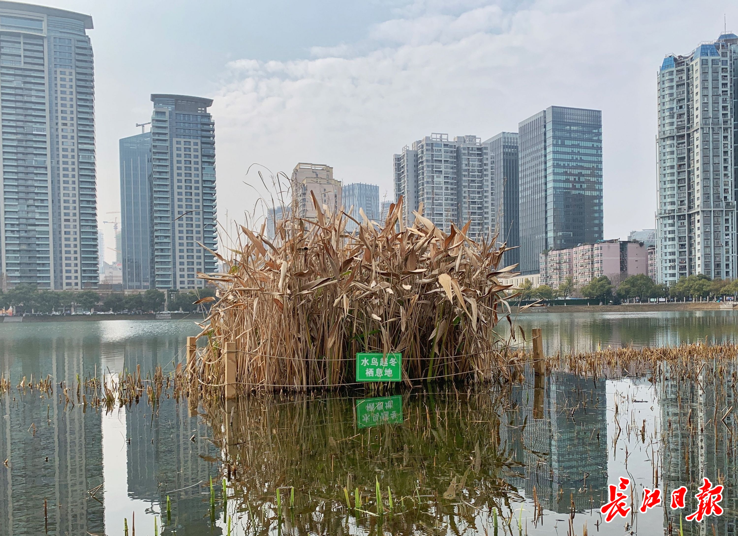 长江日报-长江网记者注意到,在北湖东岸的浅水区域,有3处已经枯黄的“草垛”伫立在水里,“草垛”周围被木桩和绳索围住,并挂着一块写有“水鸟越冬栖息地”的绿色标识牌。
