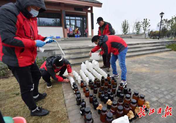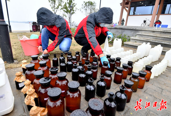 长江日报-长江网3月8日讯 2021年3月8日,在金银湖东大湖水域,东西湖区水务局工作人员冒雨将从湖里取样的湖水分类装瓶,准备进行水质检测。取样人员介绍,今年以来,东西湖区加大了水环境治理力度,对辖区主要的二十多个湖泊每月定期检测,根据检测数据判断水质是否提升或者下降,并采取相应治理措施,如截污、清淤、生物净化等,促进水环境进一步提升。(记者喻志勇 摄影报道)