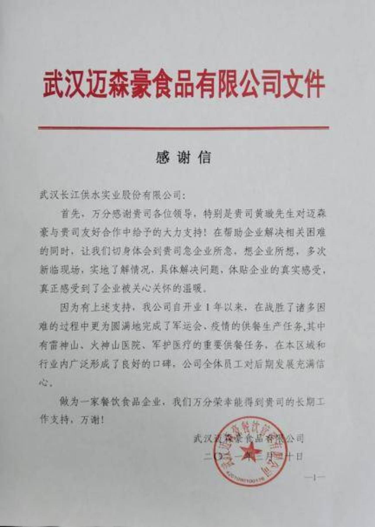 “因为有上述(长供供水的)支持,我公司自开业1年以来,在战胜了诸多困难的过程中更为圆满地完成了军运会、疫情的供餐生产任务。”信中写道,因为有长供公司在供水方面的服务支持,让迈森豪公司在行业内形成了良好的口碑,公司全体员工对后期发展充满信心。