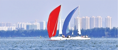 2020年10月1日,在东湖帆船基地,“2020年全国桨板锦标赛”参赛选手在广阔的东湖湖面上你追我赶,成为一道亮丽的风景。