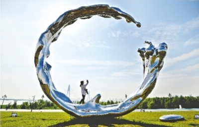 2020年5月22日,在汉口江滩四期园区,游客与雕塑《长江之约》“合影”。