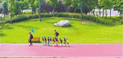 武汉沿江江滩改造升级后,江滩已成为一道亮丽的城市风景线。图为孩子们在青山江滩绿道上练习轮滑。