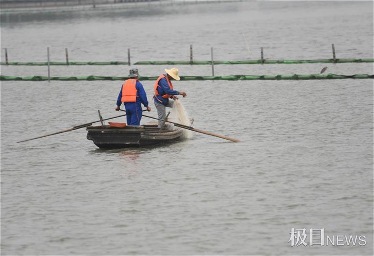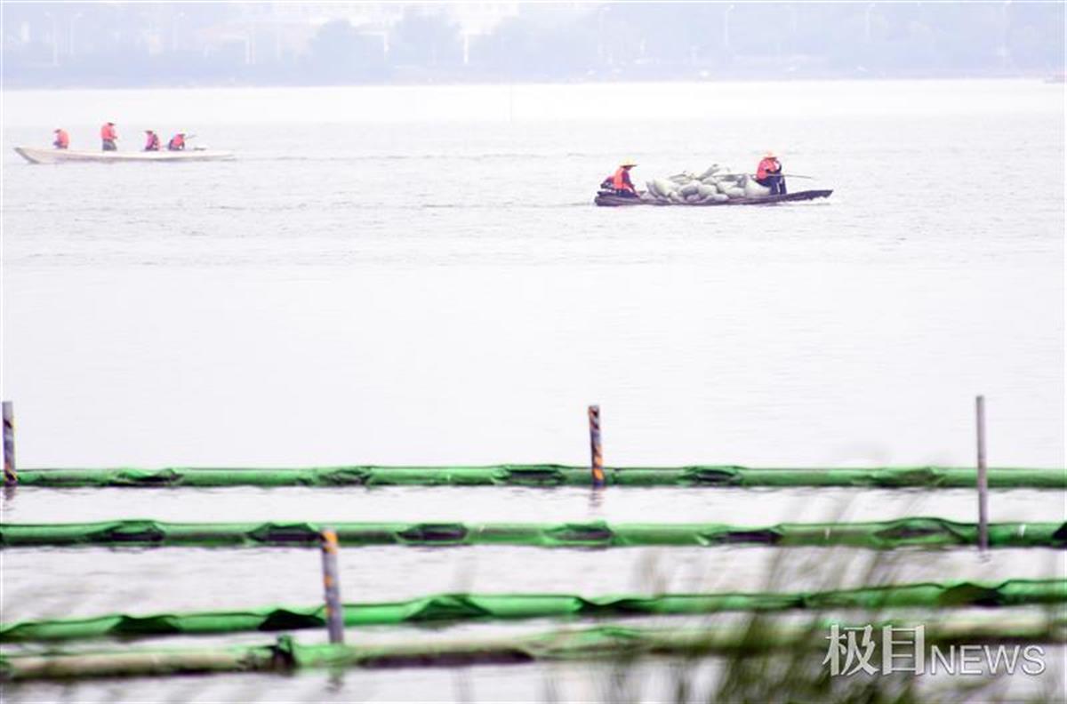 湖面上空,鹭鸟飞翔;湖中,有工人驾船往湖底布网,给种草打底;施工浮台上,一组工人往湖底布置水草,另一组工人则拿着4米多长的竹竿,像插秧一样,将沉水植物种植到湖底。据悉,栽种的沉水植物,具有净化水质的作用,可以转化水中的氨、氮元素,让水体保持洁净。