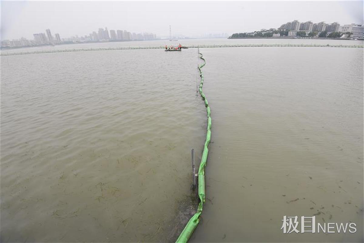 在现场,施工人员已在湖中布下数公里长的拦草浮漂隔离带,把湖面分隔成了多个区域。