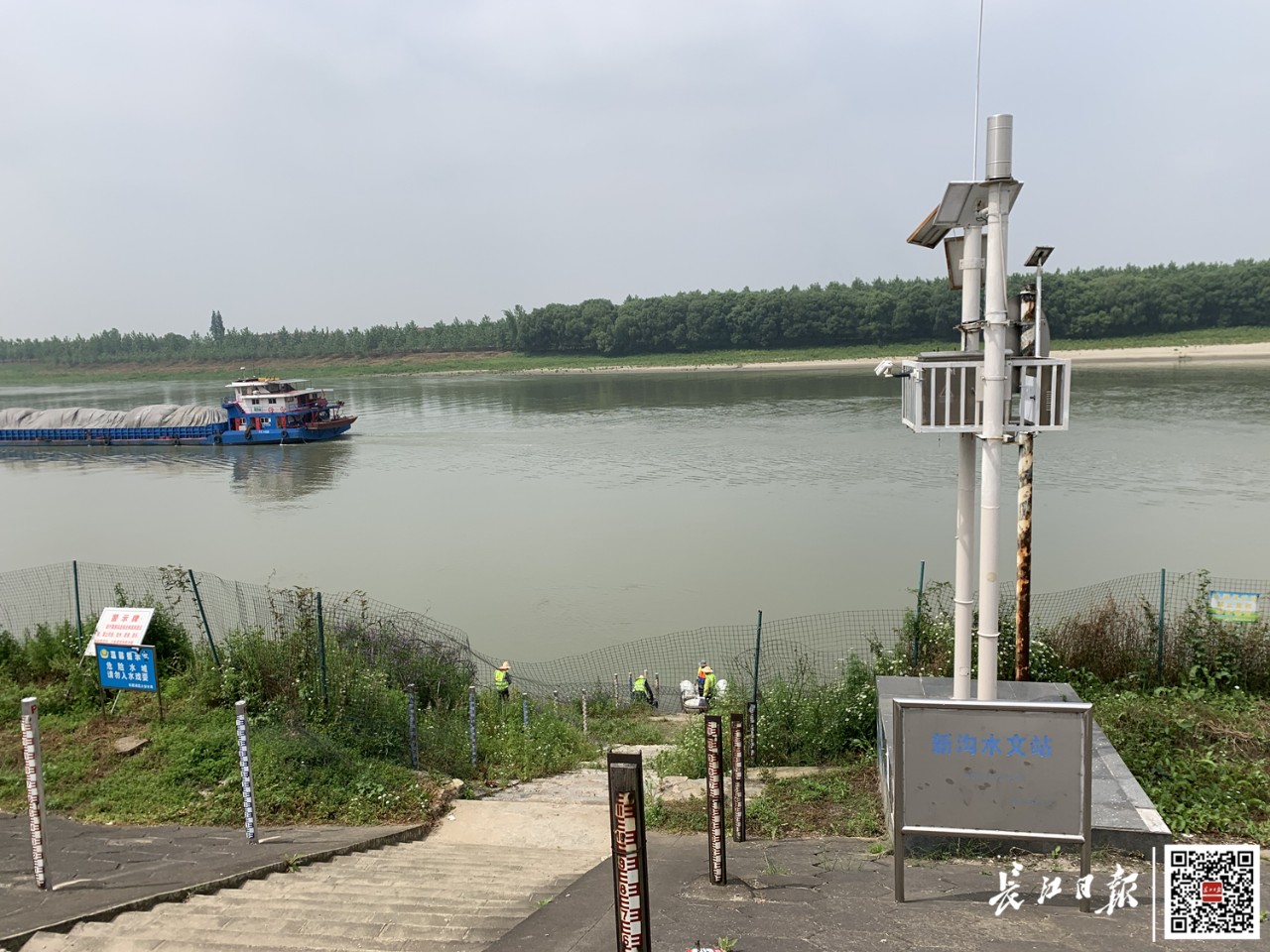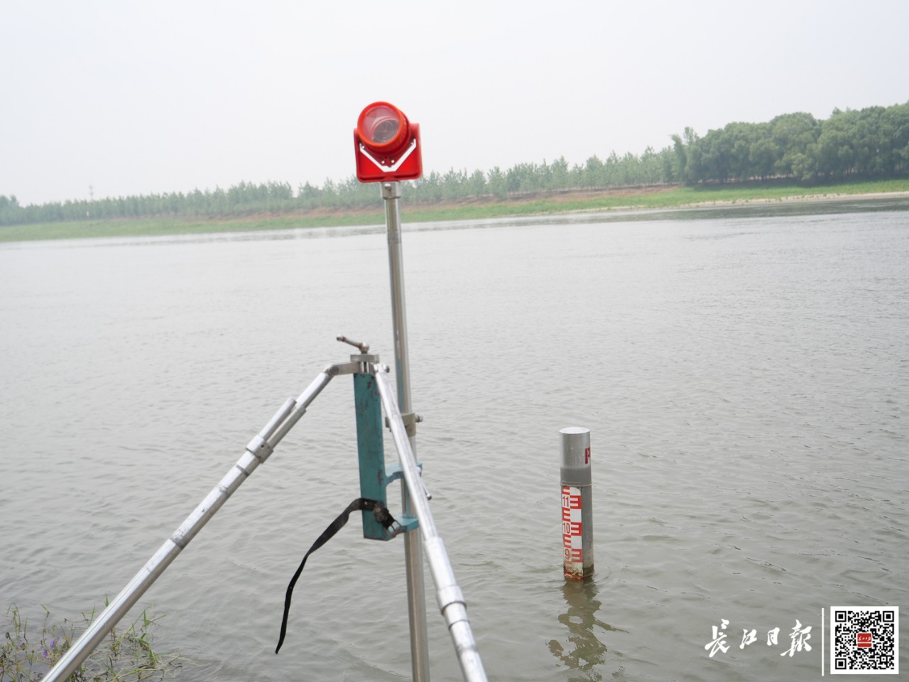 “你在堤上,我下江边,咱们一起把水位测出来。”王伍龙招呼同伴,拿起一个类似三脚架的仪器走下堤去。同时,他的同事在堤上架起另一台仪器。