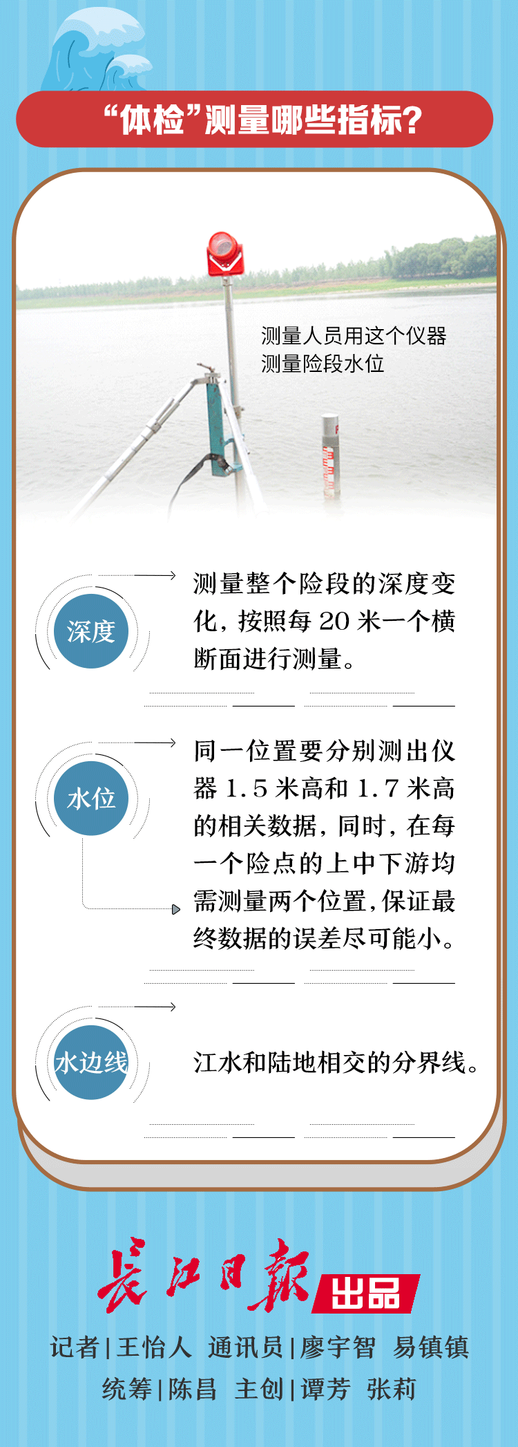 王伍龙还表示,和给人体检一样,险段体检也要测量“三围”——也就是深度、水位和水边线这三个数据。