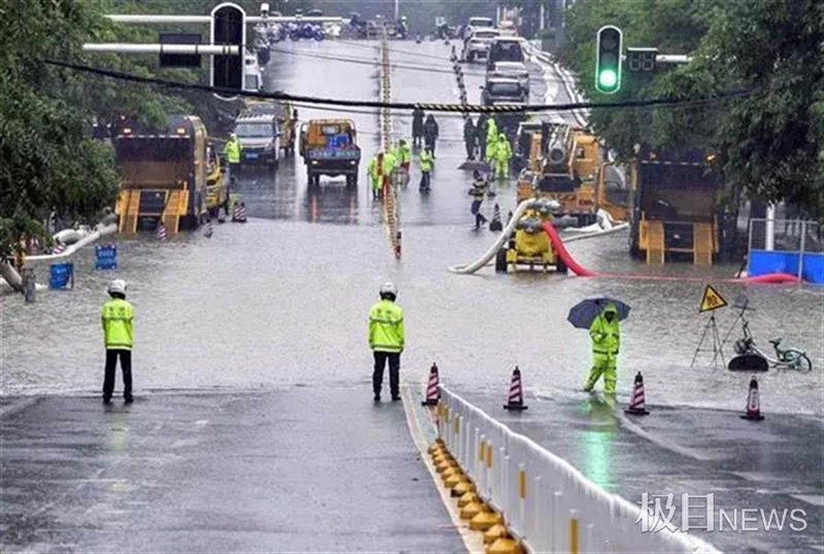 虽已完善了排水系统,水务人员仍在雨中值守,以防意外