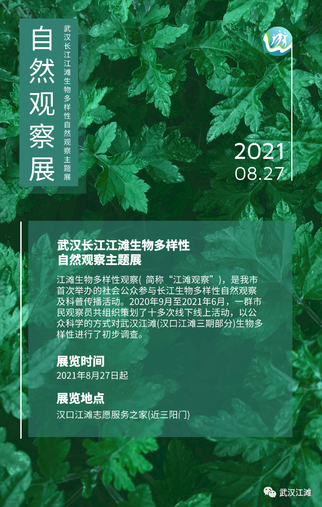 日前,武汉全域调整为低风险区。位于汉口江滩的横渡长江博物馆、志愿服务之家等室内公共场所27日起逐一开放。借此契机,2021年8月28日,武汉长江江滩生物多样性自然观察主题展将在志愿服务之家举行。