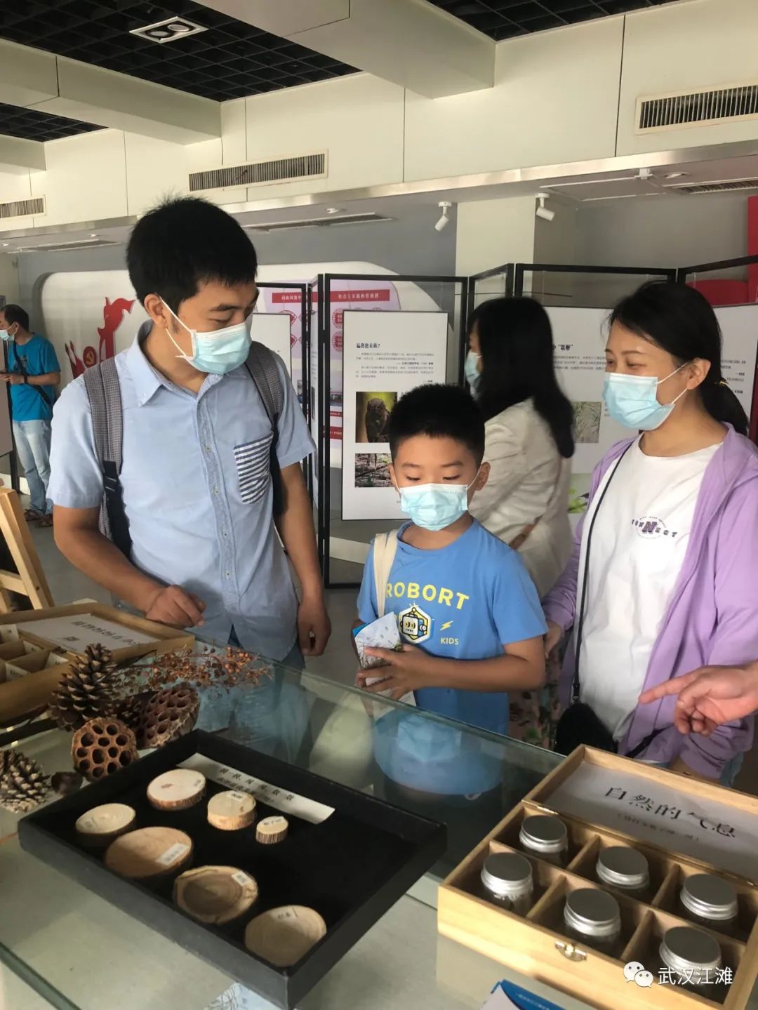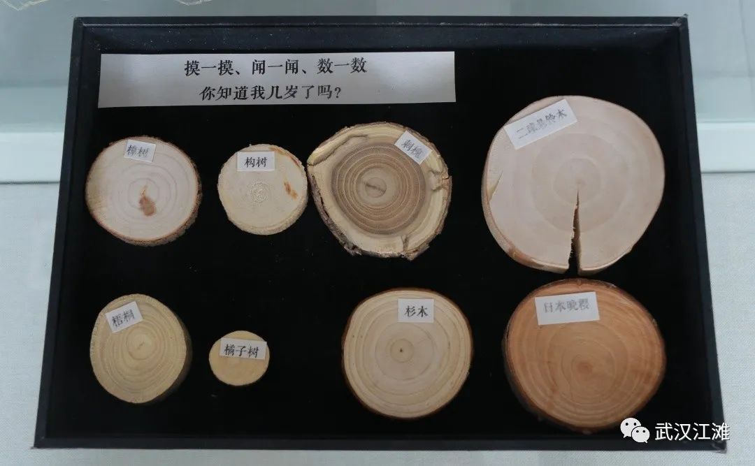 展览现场,家长带着小朋友来寻找自己的作品,合影留念。现场进行了趣味互动,根据树轮猜树木的年龄、了解植物种植的作用、闻味道猜植物等。江滩观察员带领小朋友们一起进行户外拓展,观察叶子的形态,进行叶形拓印创作。