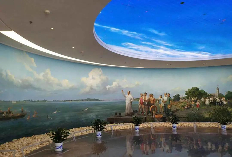 步入武汉横渡长江博物馆一楼序厅,迎面便是巨幅半景画《万里长江横渡》,画面描绘毛泽东渡江前,与岸边群众挥手致意的场景。画中的宽阔长江,与天顶的液晶屏模拟的江鸥飞翔,共同营造“极目楚天舒”的雄浑气势。