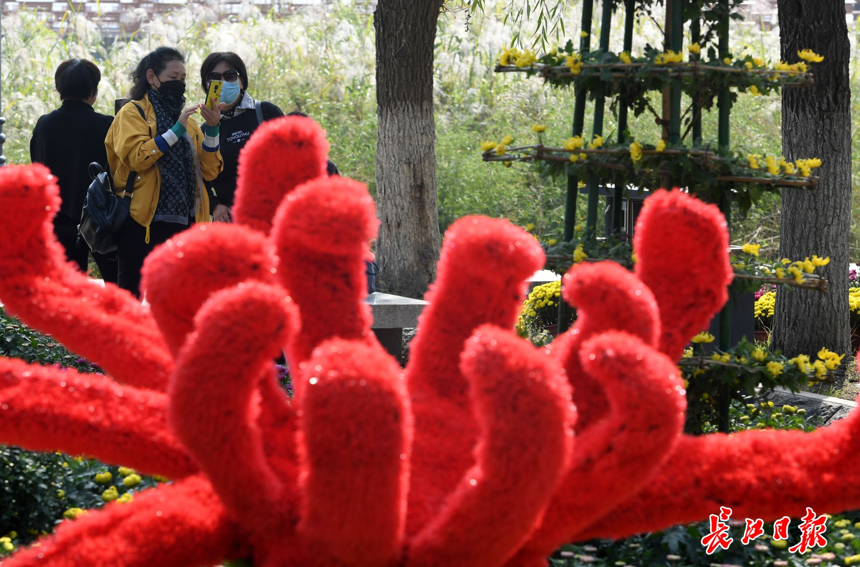10月25日,汉口江滩风帆广场,工作人员正紧张搭建菊花展台,各种菊花扎景已具规模。各类菊花色彩斑斓、奇姿异彩,吸引了不少市民前来观赏,提前尝鲜。