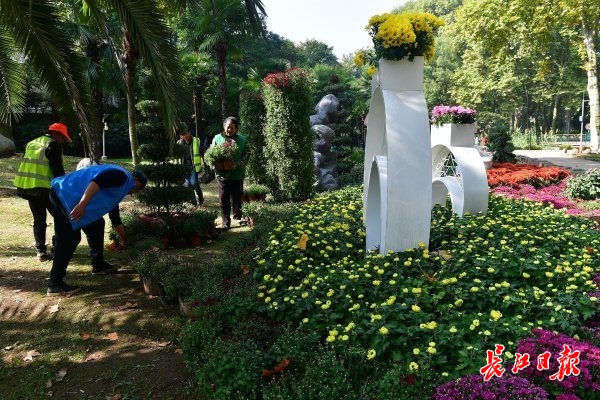 记者在解放公园展区看到,布展已进入尾声,各种大型扎景已完成,工作人员正在摆放装饰氛围的菊花。2021年武汉金秋菊展将于10月28日至11月30日展出,展览地点覆盖全市15个城区,本届菊展以“百年辉煌看今朝”为主题,将布置303组菊花小景,展出菊花近2000种160万盆、各类时令花卉60万盆。