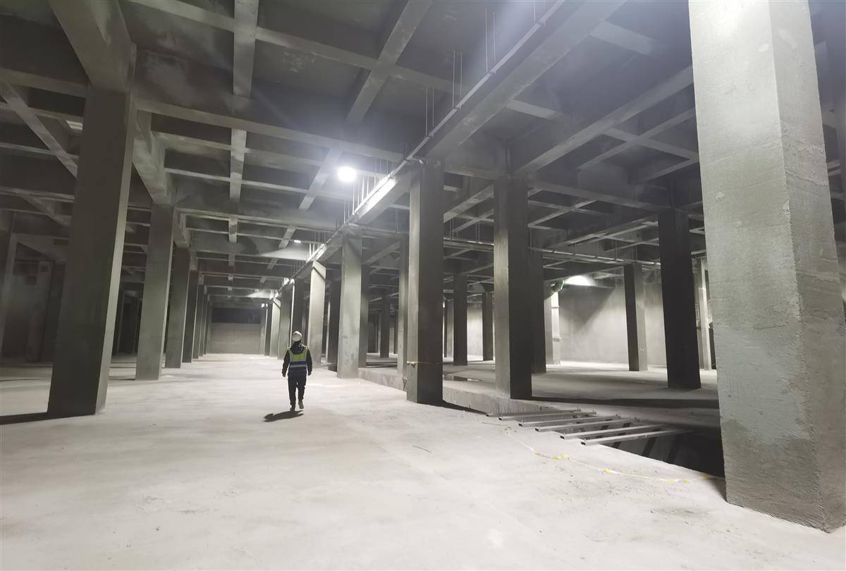 从设备间顺着步行梯走进巨大的“水泥盒”,调蓄池内场景蔚为壮观。内部空高为8.5米,接近3层楼高。梁柱林立,一眼看不到边。