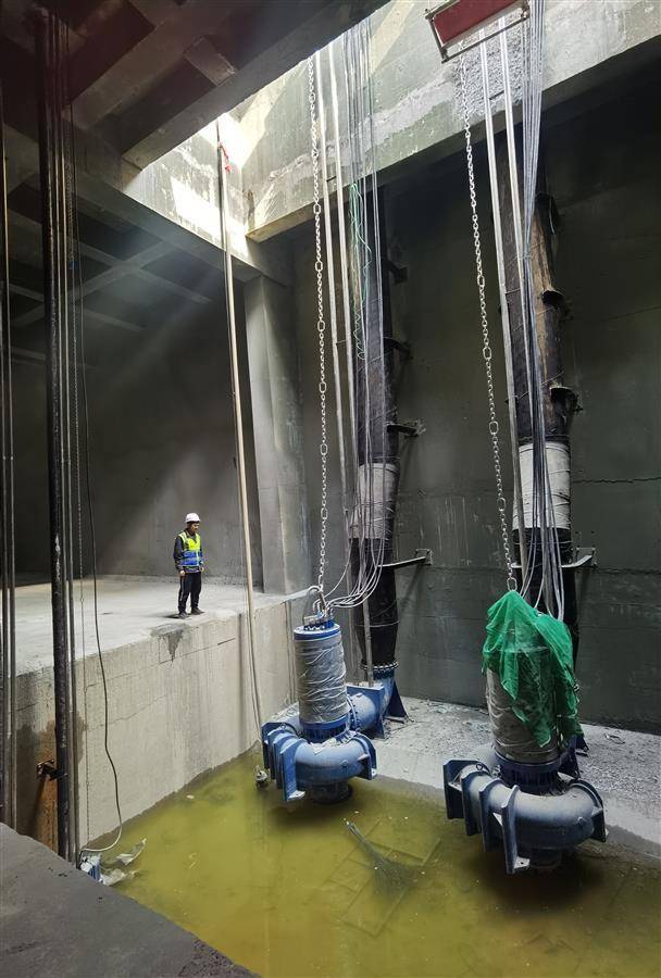 原来,调蓄池靠进水箱涵一侧有6个通道共计12道闸门。两米多高的闸门同时开启,可迅速吸纳雨水。一旦外部降雨高峰期过了,再通过三台一人多高的耦合式潜污泵对外抽排。每个泵抽排能力为每小时3600立方米,10个小时左右便能将箱体内的水全部抽排到疏水箱涵内。一放一抽之间,实现“吐纳自如”。