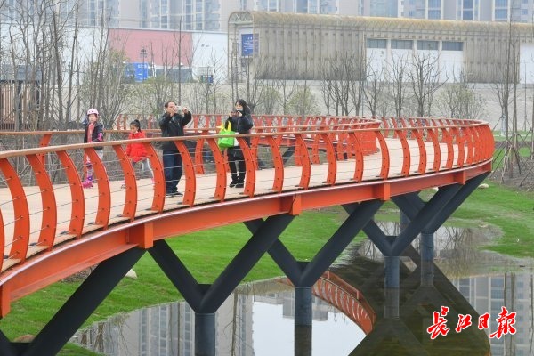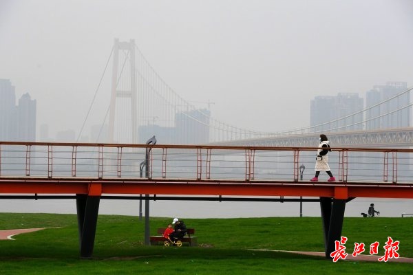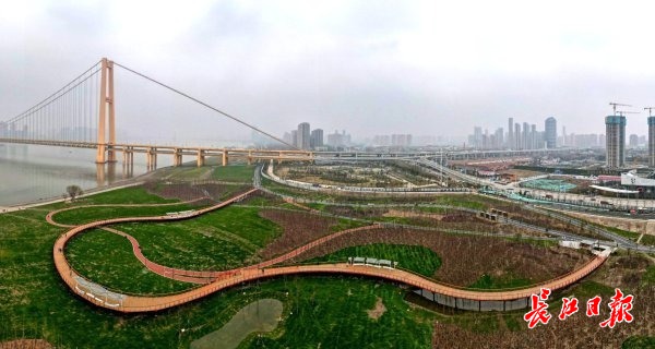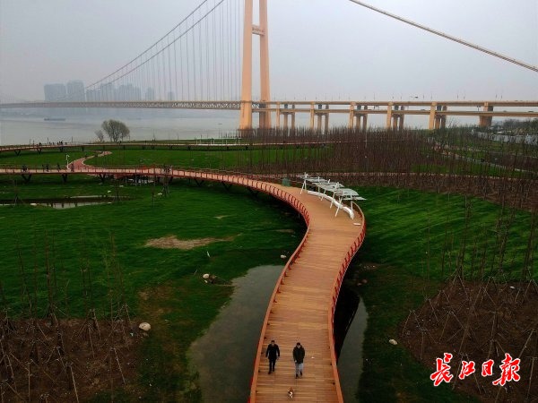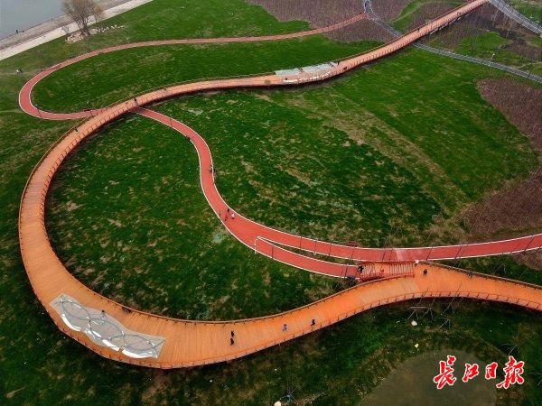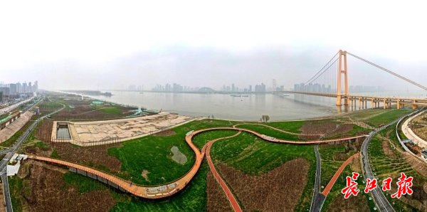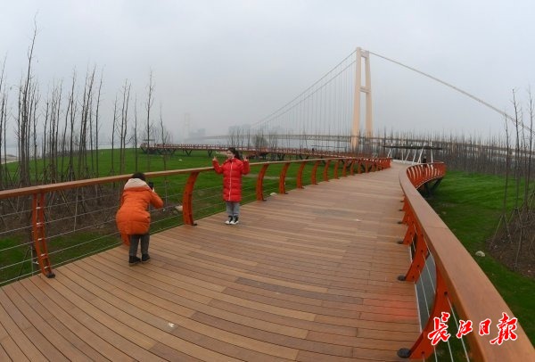 2月12日,杨泗港长江大桥下的洪山江滩上,一条长约500米的S形栈道从草坪上跨过,成为武汉长江畔最美的观江栈道,不少市民游客来此打卡。洪山江滩是武汉百里生态文化长廊的重要节点工程,也是“两江四岸”规划实施的中心城区最后一个江滩。