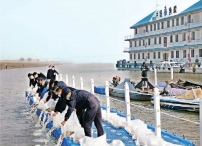 长江武汉渔政码头,12位执法人员代3名违禁在长江捕鱼的被告人将73.76公斤成鱼、13.83万尾鱼苗放还长江。