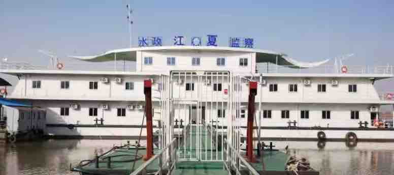 据介绍,去年该中队引进了该艘趸船,停靠在长江金口码头,作为中队办公和生活场所,便于执法队员24小时值守办公,随时出船巡查。该趸船长约65米,宽约11.5米,共设有三层区域,分为工作区和生活保障区,设置有视频监控室、办公室、指挥室等功能室,充分满足打击非法采砂工作需求。