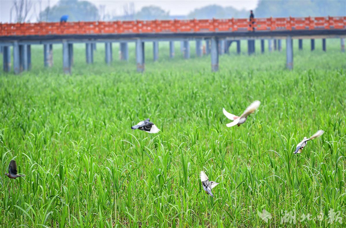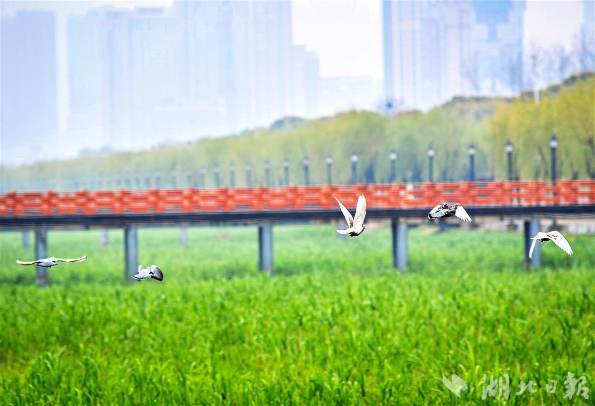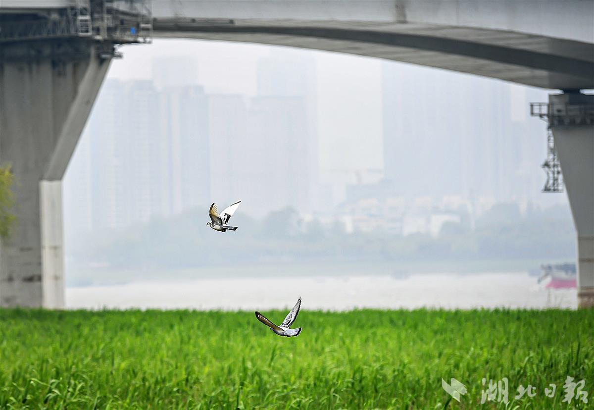 3月31日,在蒙蒙细雨中,汉口江滩的鸟翩翩起舞,或漫步在亲水平台上,与市民亲密接触。
