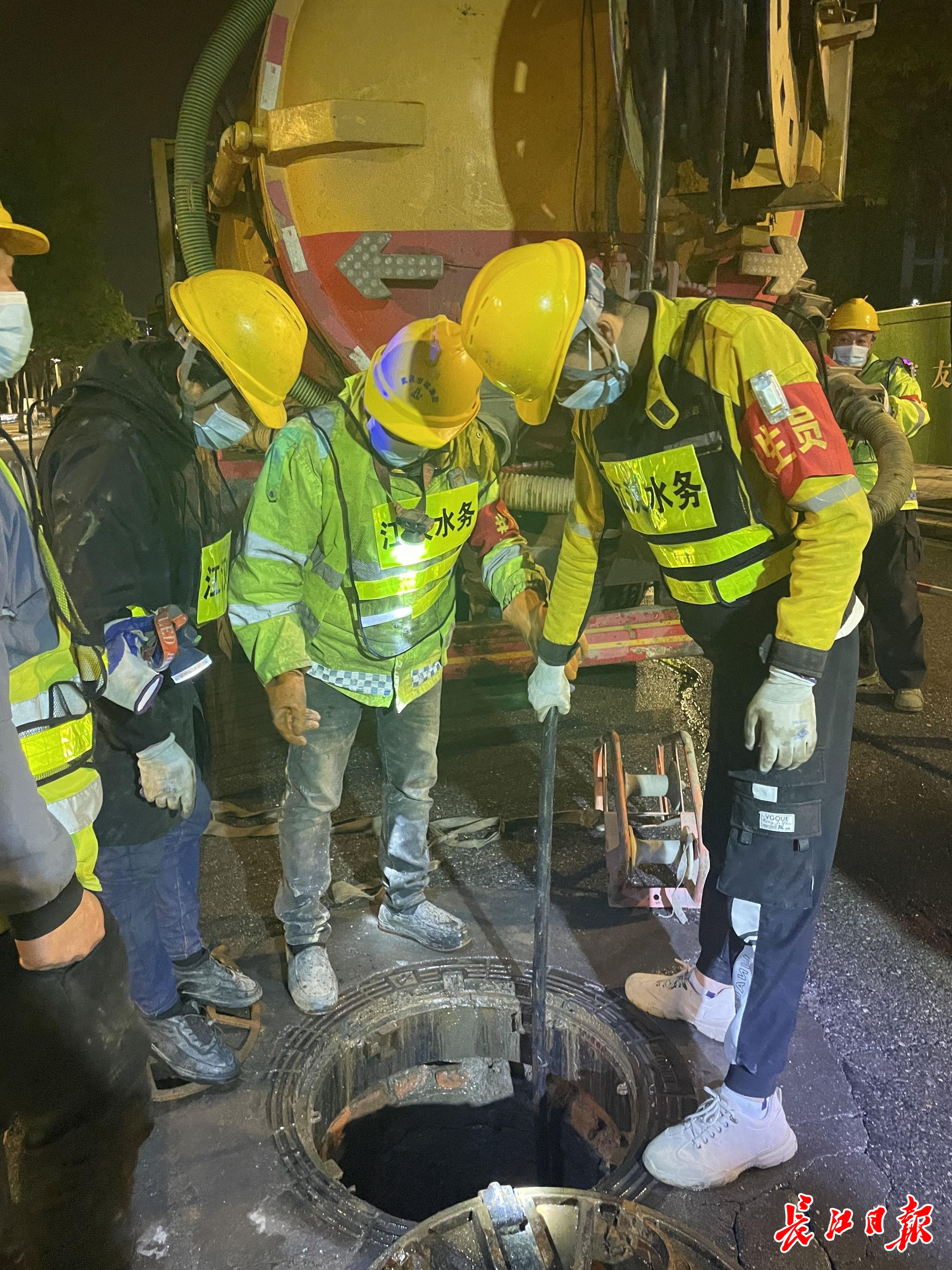晚10点的后襄河北路车辆稀少,江力争和同事们就着路灯灯光对雨水井所在的内车道进行打围,给清淤工作腾出位置。