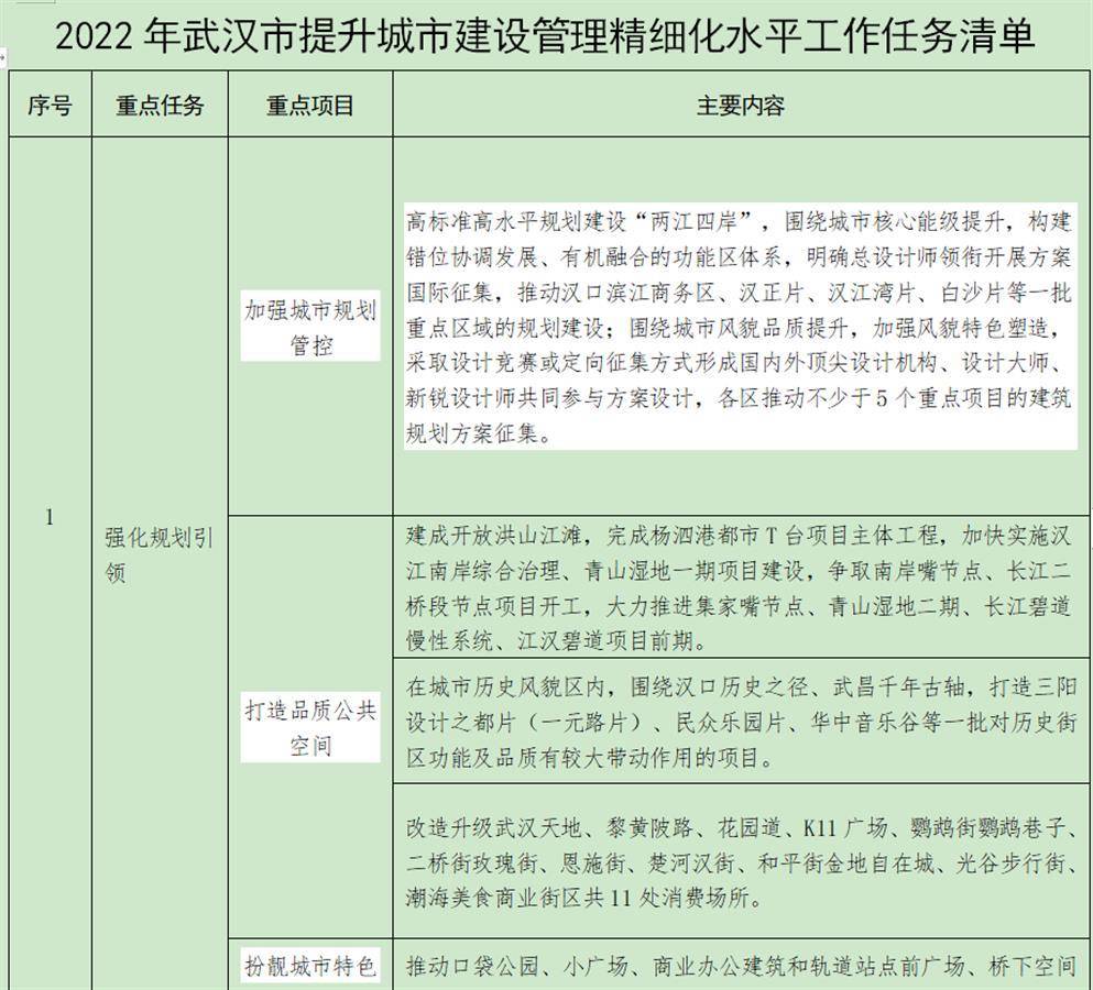 4月7日,武汉市召开城市精细化管理工作会议,会上发布《武汉市提升城市建设管理精细化水平三年行动方案(2022-2024年)》及《2022年武汉市提升城市建设管理精细化水平工作任务清单》,对全面提升城市建设管理精细化水平,持续推进城市环境品质提升作出相应部署。