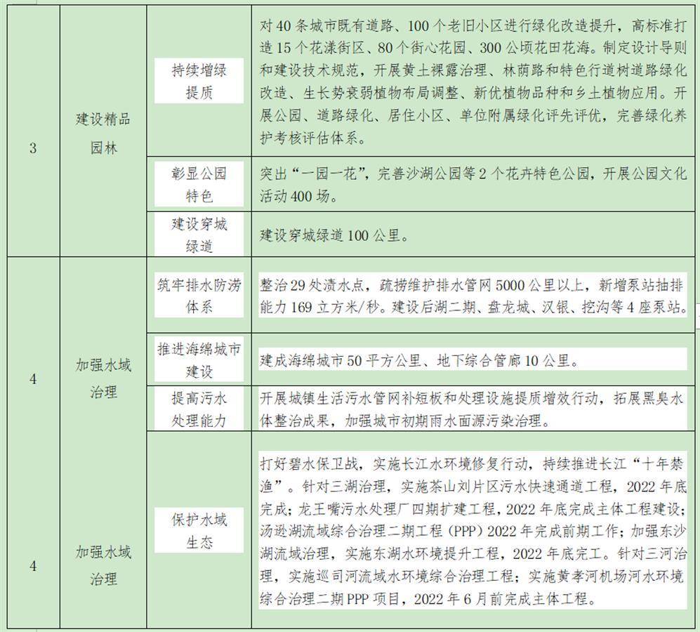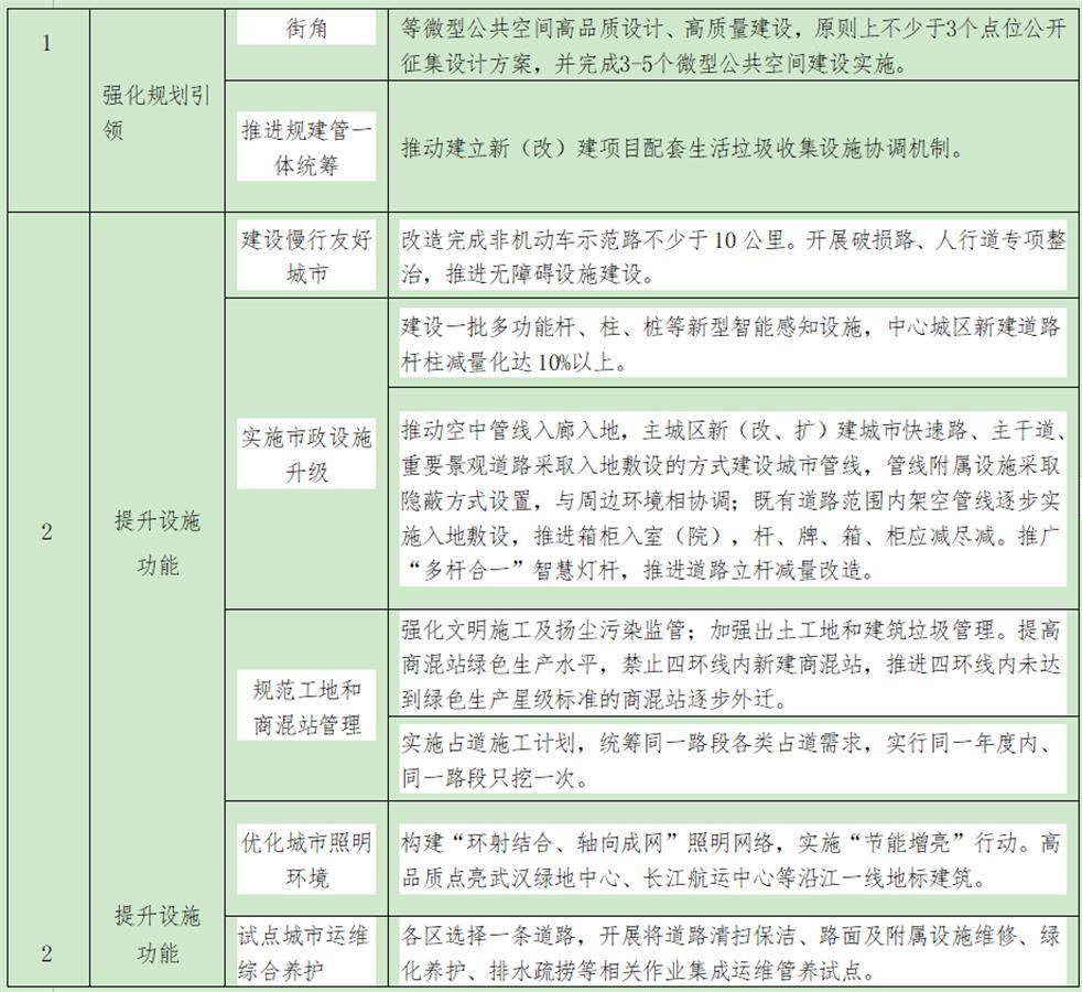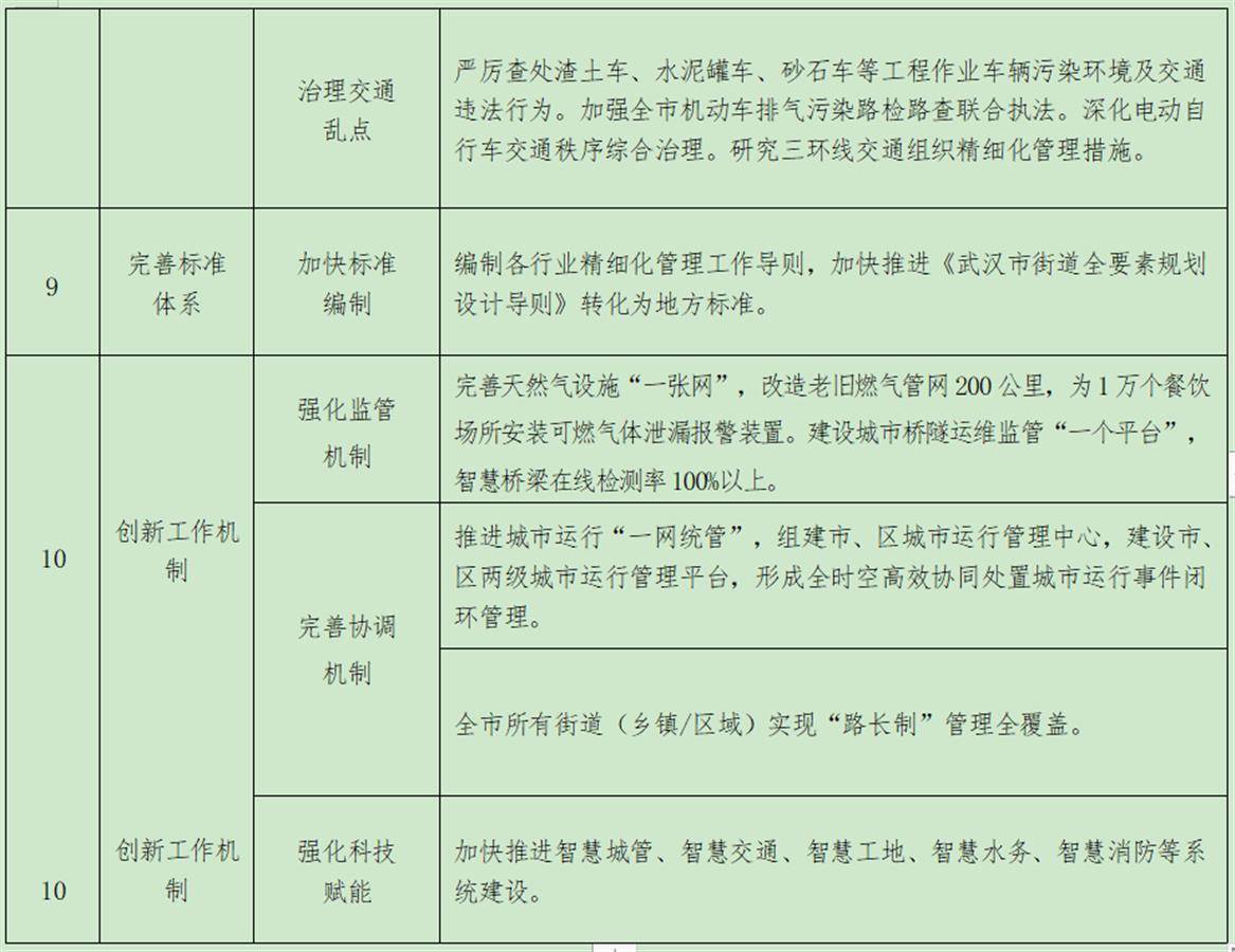 为此,武汉市将从强化规划引领、提升设施功能、建设精品园林、加强水域治理、打造洁净城市、塑造靓丽市容、改善居住环境、实施畅行交通、完善标准体系、创新工作机制十个方面落实32项工作任务。