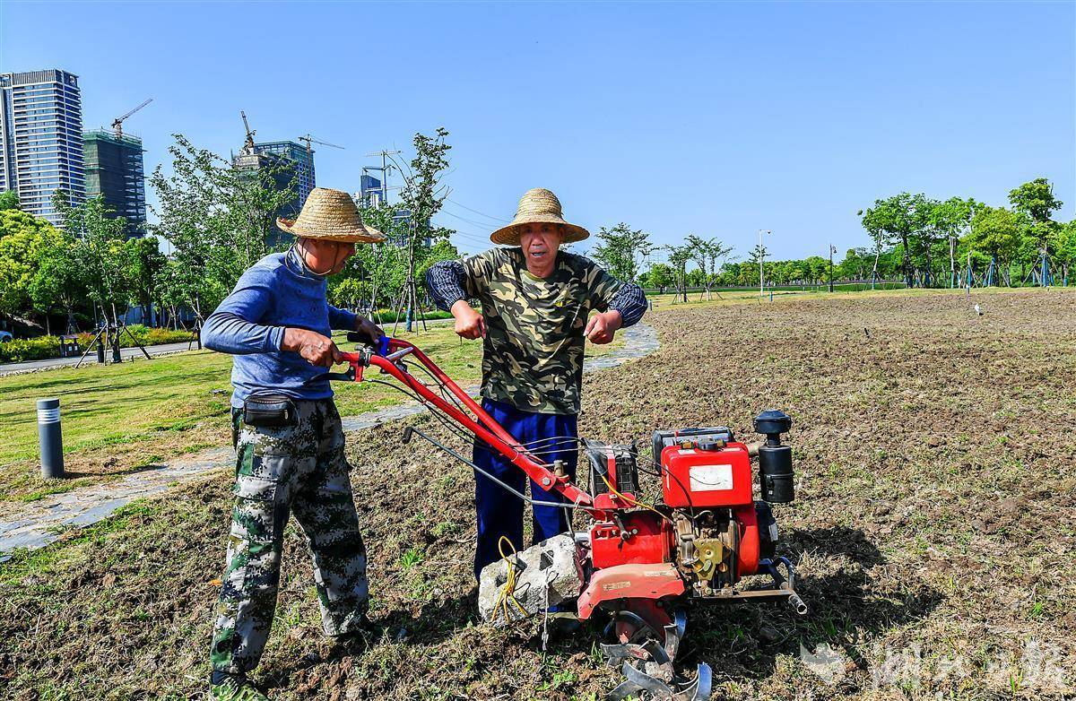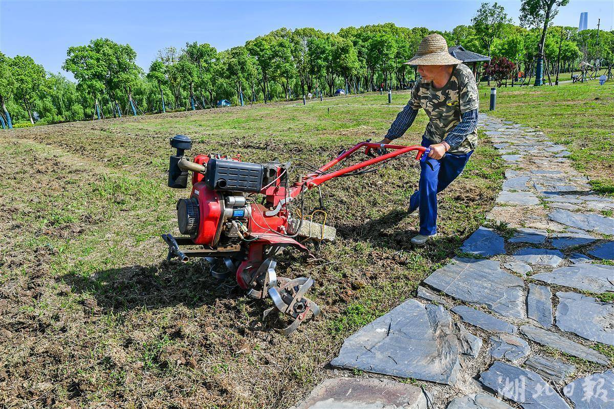 4月21日,汉口江滩四期的一块空地上,两名工人用开荒机开荒,一大片野地被开荒出来。