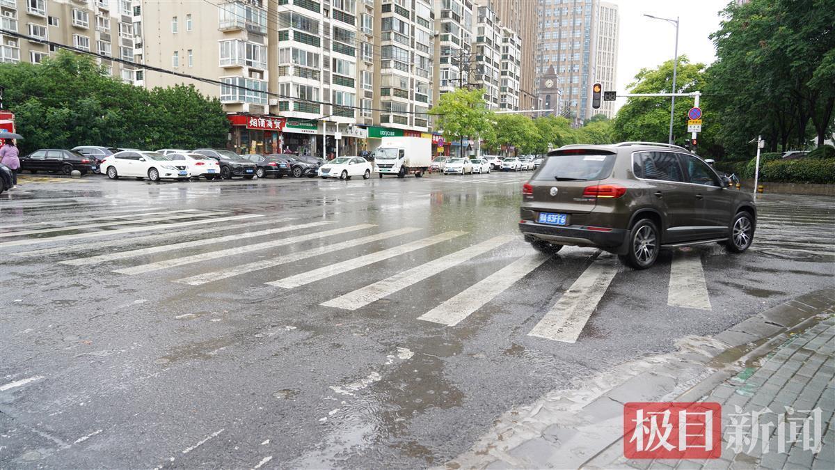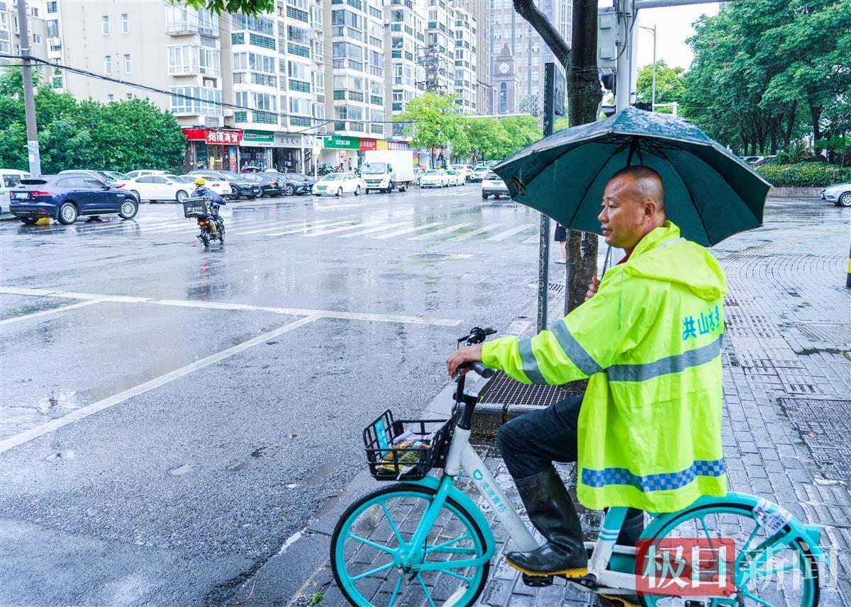 6月4日13时许,武汉遭暴雨袭击。在洪山区杨家湾,洪山水务关山排水组的朱树勇,雨中安坐在自行车上,观察虎泉街和尚文路交叉口及周边的水情:暴雨没有形成渍水。