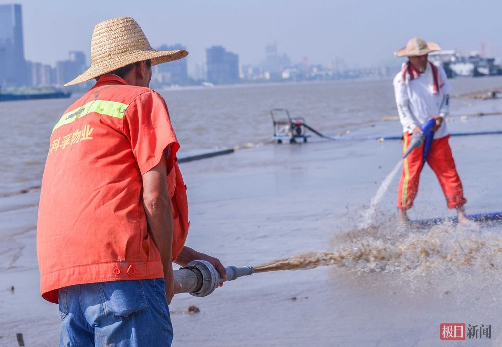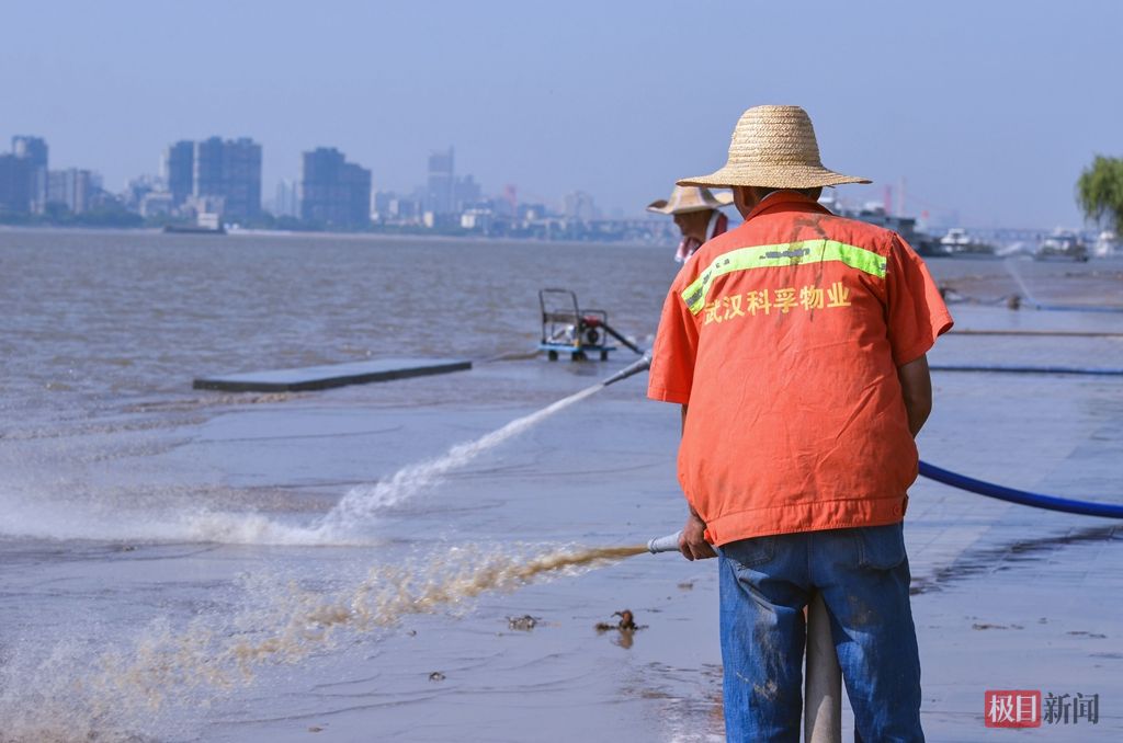 7月19日,长江水文网显示:15时00分,武汉长江水位已降到21.80米以下。长江江水逐步退出亲水平台,但在曾淹没的近7万平方米的亲水平台上留下大量淤泥与携带的垃圾,为让市民游客有一个干净的游玩环境,水退一寸,汉口江滩管理处人员则清淤一寸。