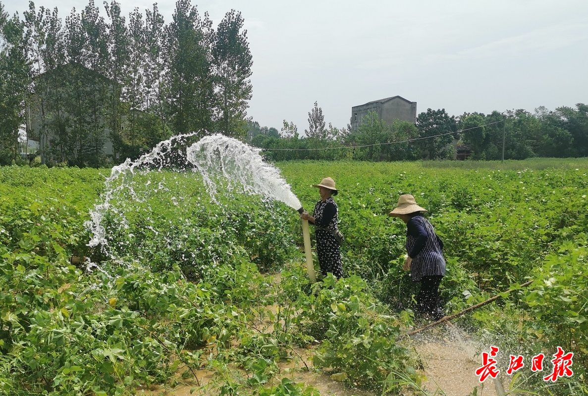 眼下正是棉花结桃的关键期,种植基地109亩棉花地里,农民手持喷水管,将从塘堰中抽出的水喷向棉田,哗哗作响,那些一度耷拉的枝叶渐显挺拔。