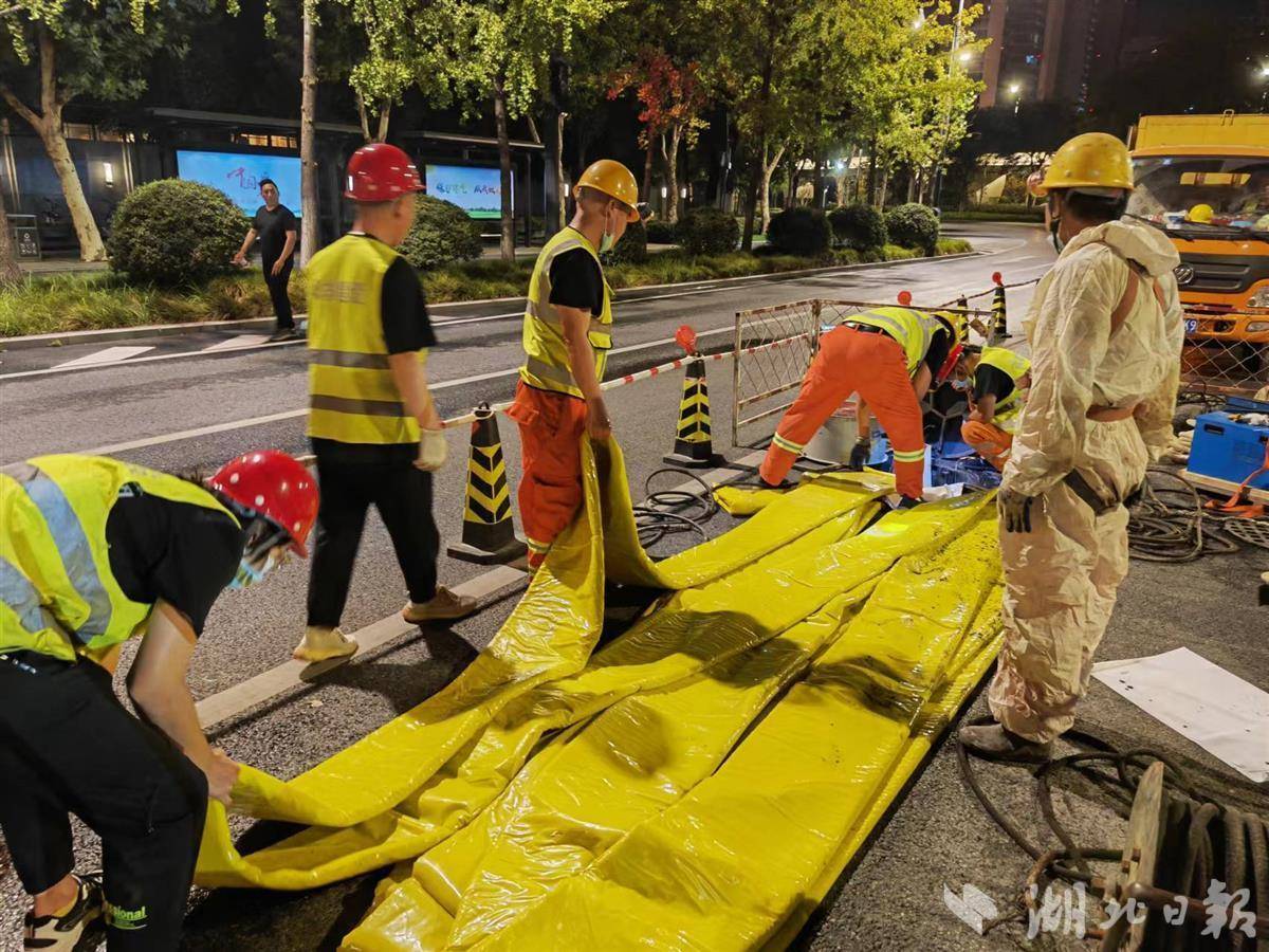 8月17日晚上11时30分许,武汉市江岸区沿江大道长江二桥下方路段,一台厢式货车停在路边,施工人员正从车内将含有玻璃钢材料的薄膜铺进地下排水管道。