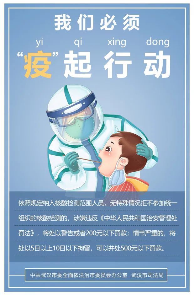 换个说法,纳入核酸检测范围的人群,如果不参加统一组织的核酸检测的,就涉嫌违反《突发公共卫生事件应急条例》的规定:有关单位和个人不配合调查、采样、技术分析和检验,可能触犯《治安管理处罚法》,构成违反治安管理行为的,将由公安机关依法予以处罚;涉嫌构成犯罪的,将依照《刑法》以涉嫌妨害传染病防治罪追究刑事责任。