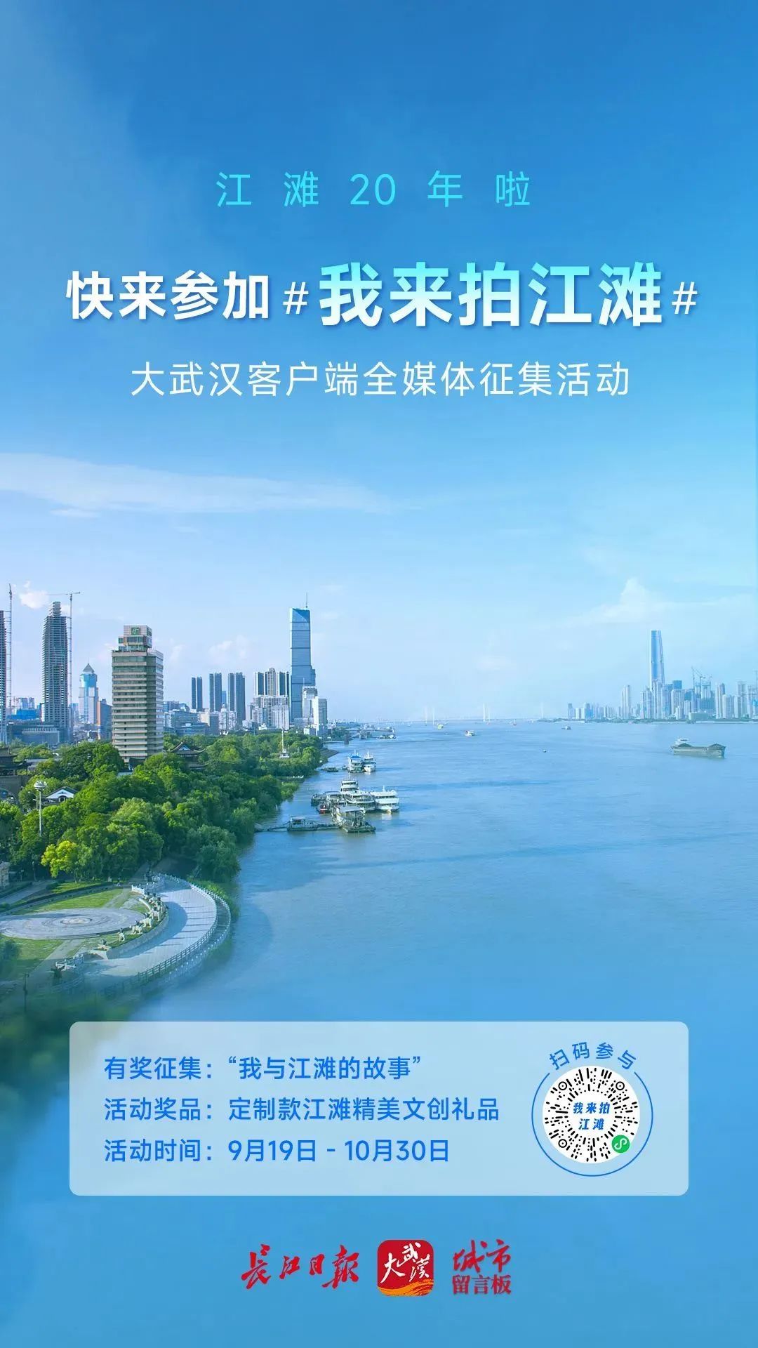 9月19日起至10月30日,长江日报联合武汉市水务局共同发起“我与江滩的故事”征集活动,公开征集以武汉江滩20年巨变为主题的故事、照片、影像等,用一个个鲜活的故事展现武汉江滩的独特魅力,传播武汉人的亲水爱水行动,展示城市的新形象。