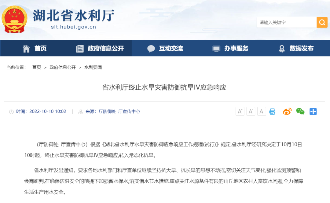 通知!10月10日起终止水旱灾害防御抗旱IV应急响应!