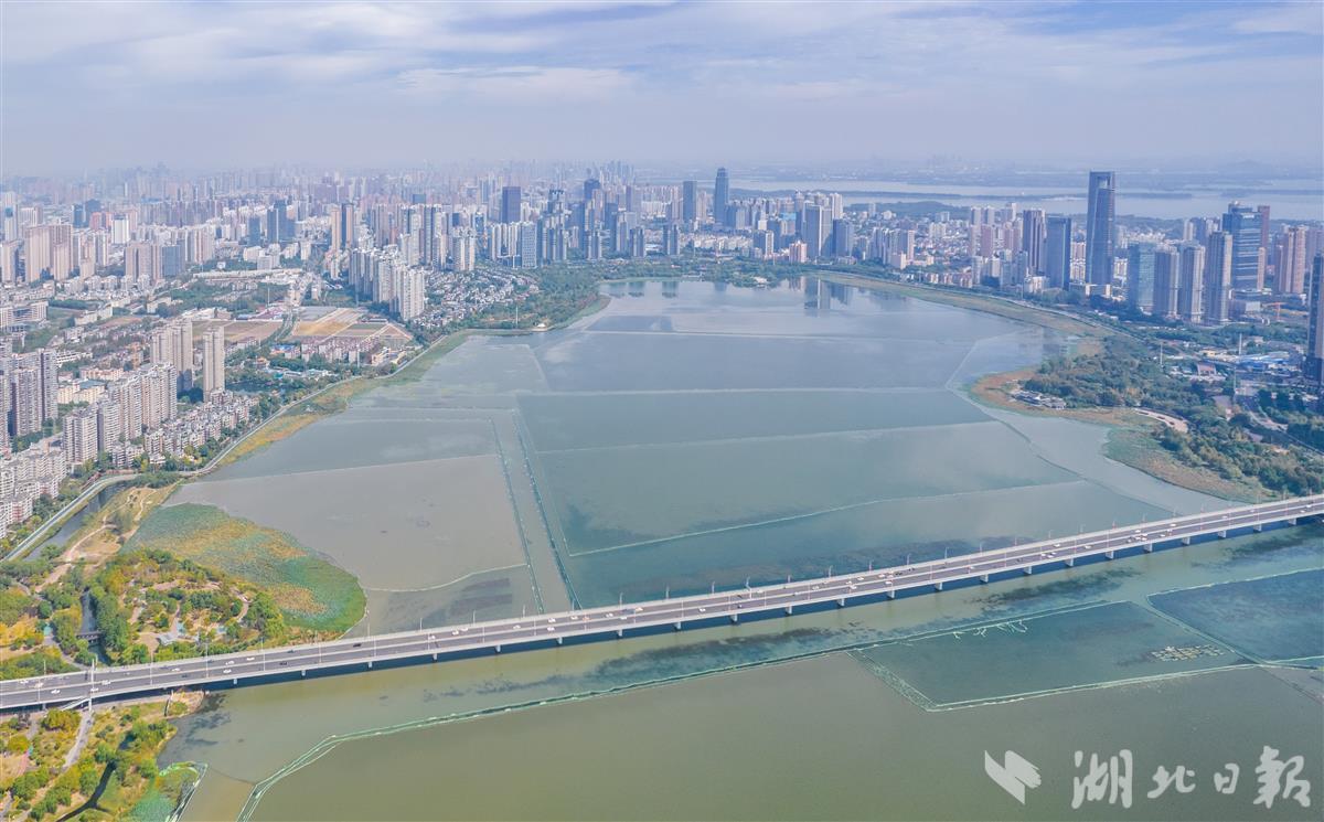 10月20日,航拍武汉外沙湖水生态修复示范区。经过一年多的综合治理,武汉外沙湖、楚河及水果湖水环境综合整治工程,已初见成效。该地区构建了177万平方米的“水下森林”,河湖水生植被覆盖度由治理前的1.2%提升至治理后的70%。