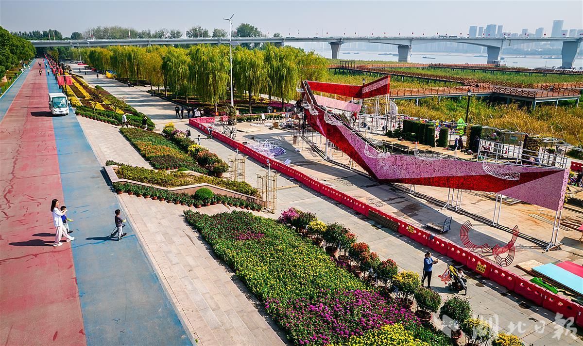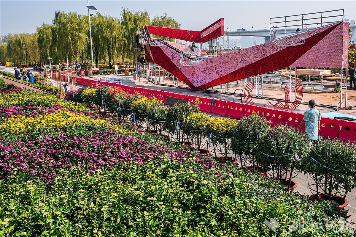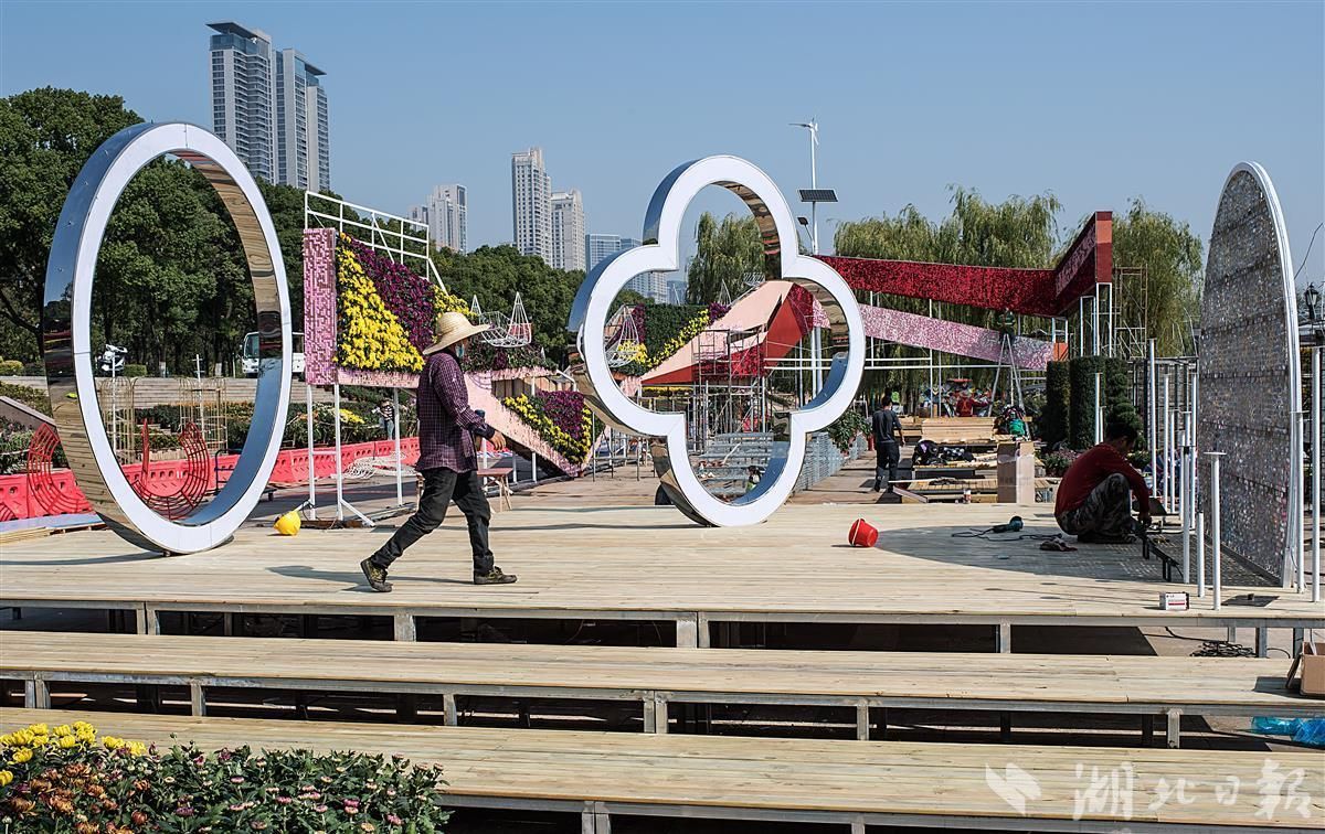 10月22日,武汉汉口江滩风帆广场上,工作人员正在为武汉市第39届金秋菊展江岸展区布展。