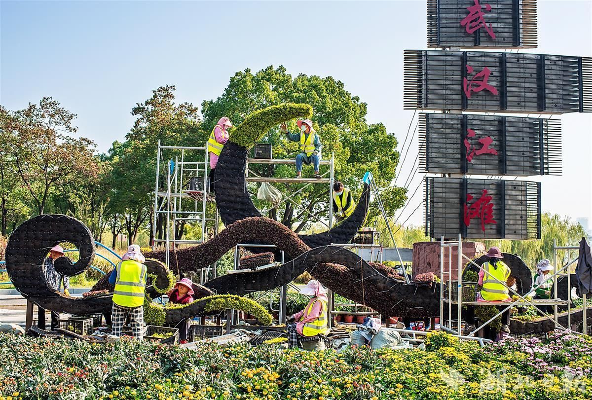 湖北日报全媒记者在现场看到,风帆广场上已搭建了各种造型新颖精巧的菊花扎景,数千盆菊花已经摆放到位,吸引不少市民游客观赏。预计11月1日,金秋菊展将完美与市民见面。
