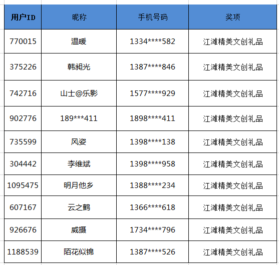 总发帖量前20名网友可获得定制款江滩精美文创礼品1份,优秀作品有机会获得奖金,活动期间还会不定期掉落礼品(30份),可重复获奖。