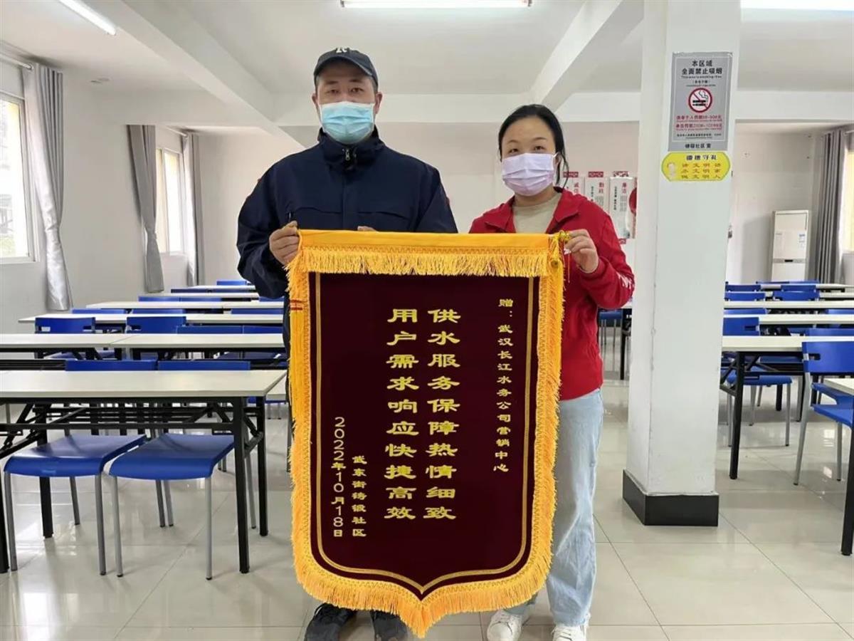 “太感谢你们了!你们服务很到位,供水服务真高效,彻底解决了社区的用水问题!这面锦旗代表社区、代表居民感谢你们!”10月27日,武汉市青山区武东街铸锻社区书记容丽,将一面写有“供水服务保障热情细致 用户需求响应快捷高效”的锦旗,送到武汉长江现代水务发展有限公司。